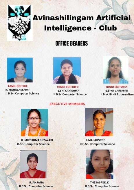 Avinashilingam Artificial (A2I) Club provides a friendly and supportive forum bringing together like-minded students and faculties discussing the risks and rewards of AI, the ethics of AI, and its role in the future society. The club arranges for AI experts and researchers to present their findings and thoughts to educate students, to build and to help students to do projects related to Artificial Intelligence, and to connect them with AI to do research in their own field.