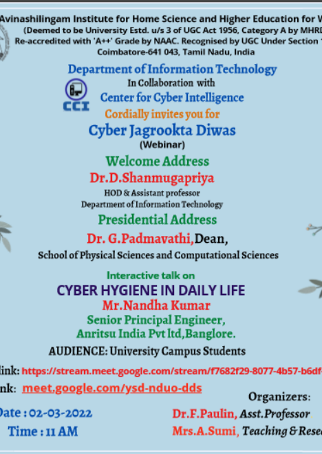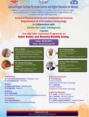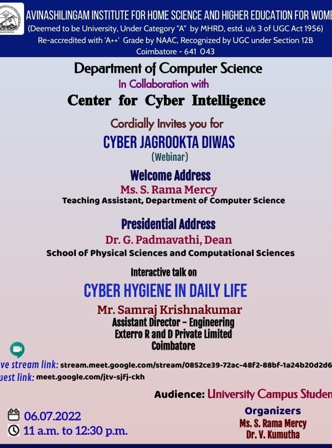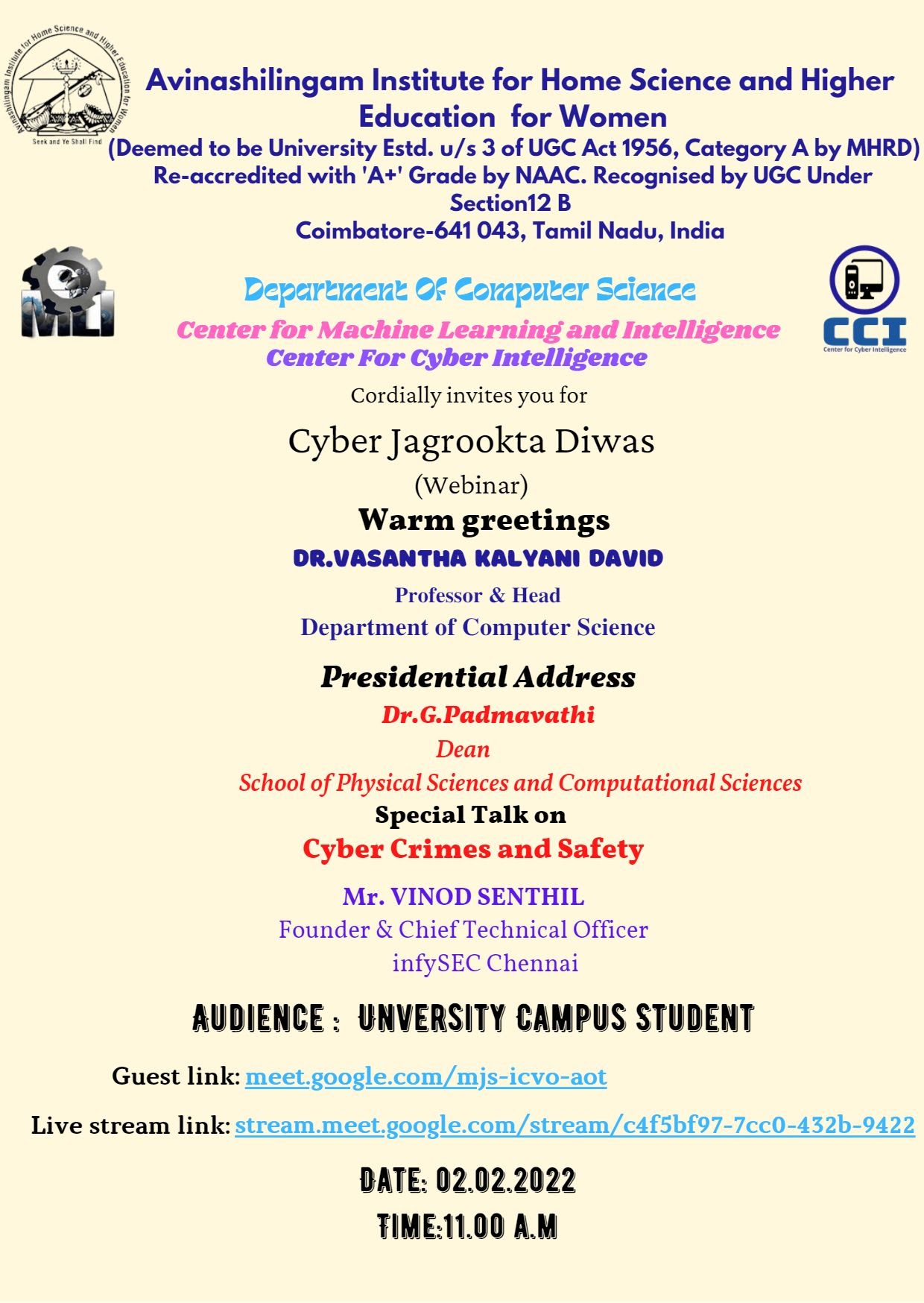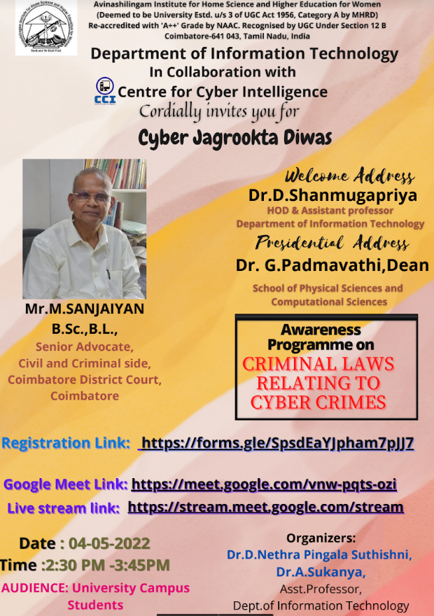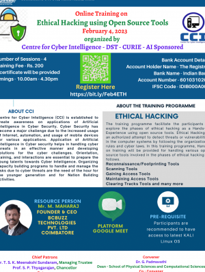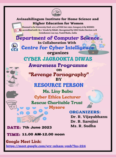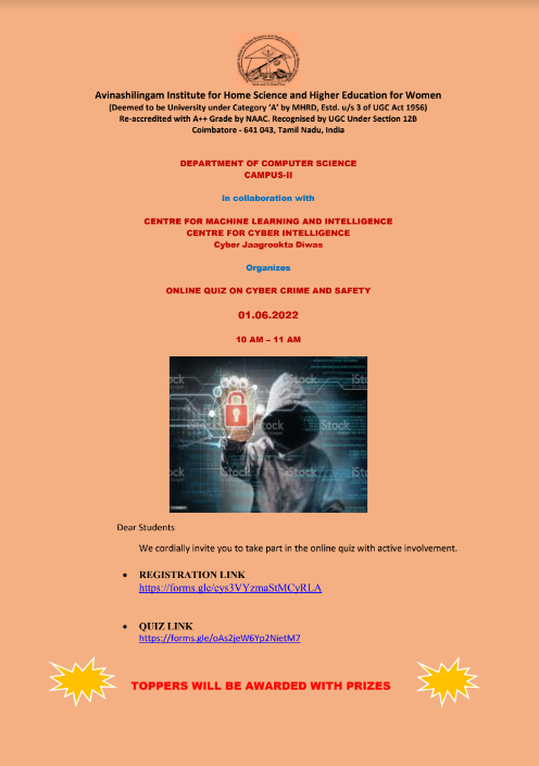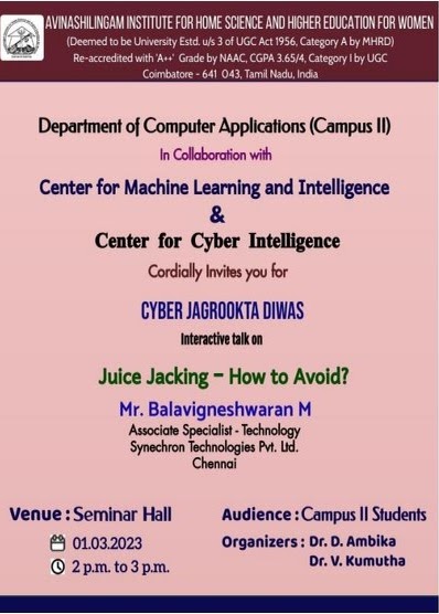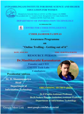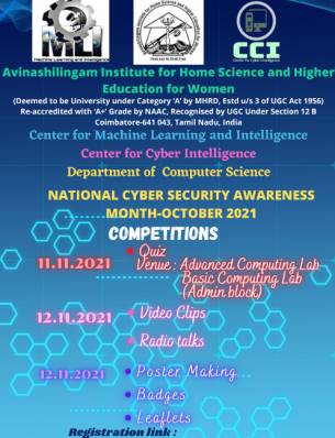 1. Conducted a "Awareness Programme on Cyber Security" for School Students of Sri Avinashilingam Higher Secondary School for Girls, Coimbatore - Feb, 2022. (Report)