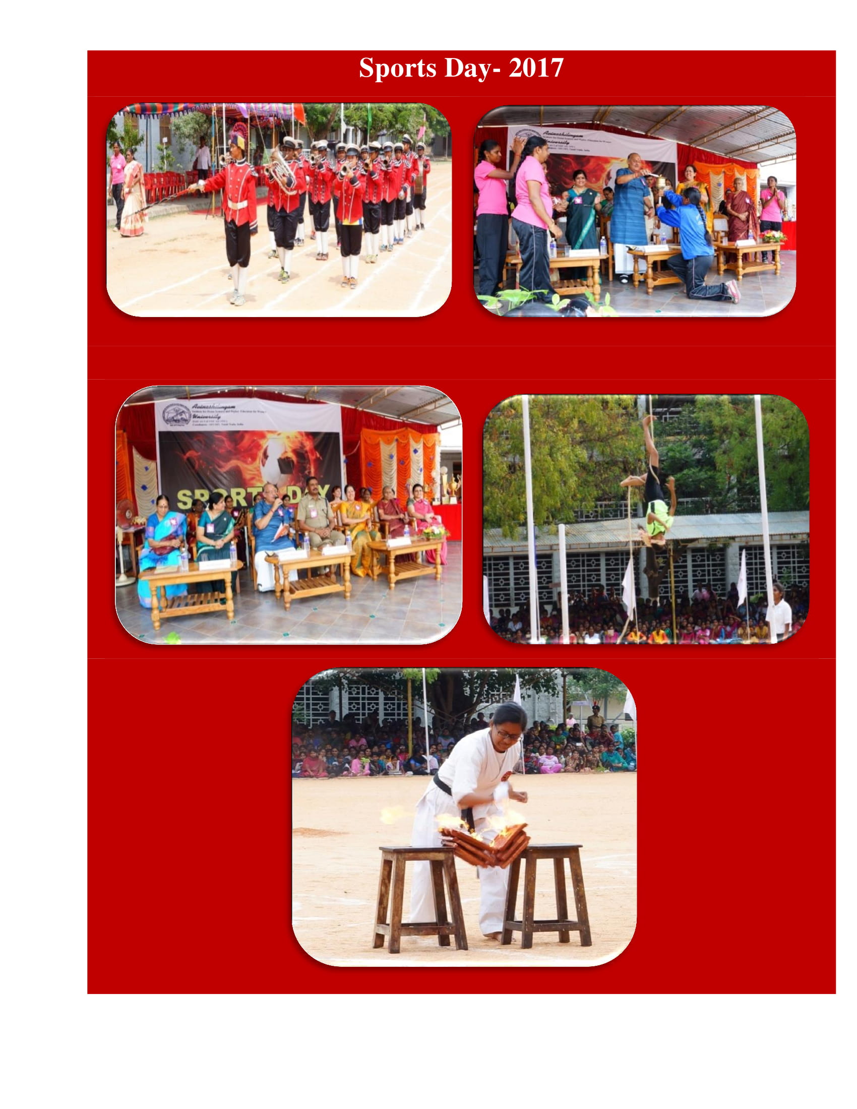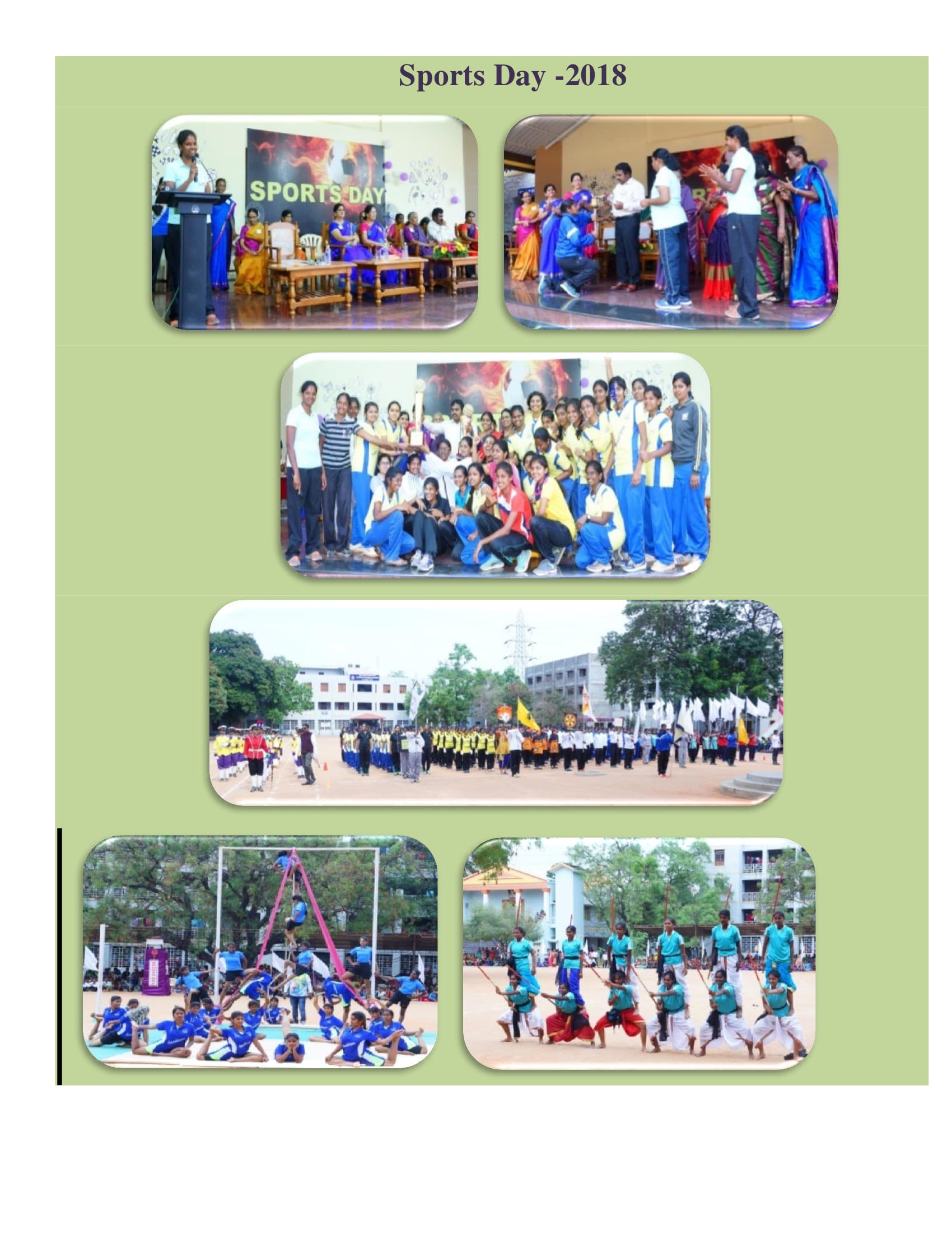 Every year Avinashilingam Institute organize SPORTS DAY - a month long intramural sports Competitions conducted for all the students in four house basis in more than 35 disciplines of various sports and events. The achievers of intramural competitions honored during sports Day. The colourful event "SPORTS DAY" begins with Olympic torch. The students of various houses also present an impressive march past, sports events, and Colorful demonstrations. The staff who achieved in intramural staff tournaments also honored in SPORTS DAY.