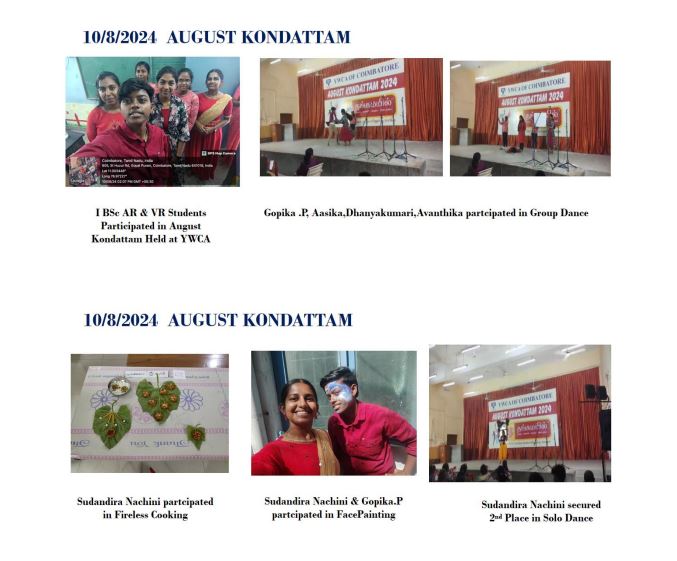 - I B.Sc. AR VR Students partcipated in Group dance , Fireless cooking, Face Painting and Solo dance competition in August Kondattam held at YWCA. In that Sudandira Nachini secure 2nd place in solo dance competition.