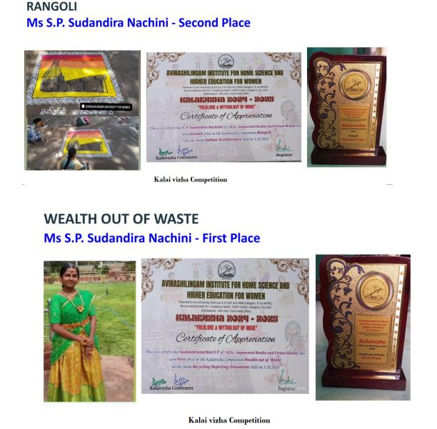 - S.P.Sudandira nachini secure first prize in wealth out of waste competition & second prize in rangoli compeition in Kalai vizha held at Avinashilingam University.