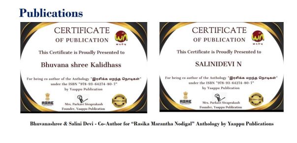- Bhuvanashree & Shalini Devi - Coauthor for "Rasika Marantha Nodigal" Anthology by Yaappu Publications.