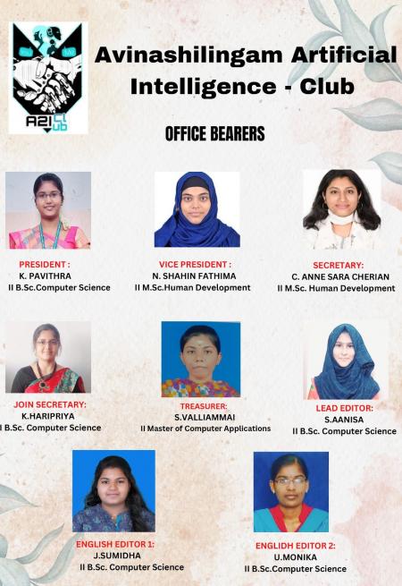 Avinashilingam Artificial (A2I) Club provides a friendly and supportive forum bringing together like-minded students and faculties discussing the risks and rewards of AI, the ethics of AI, and its role in the future society. The club arranges for AI experts and researchers to present their findings and thoughts to educate students, to build and to help students to do projects related to Artificial Intelligence, and to connect them with AI to do research in their own field.