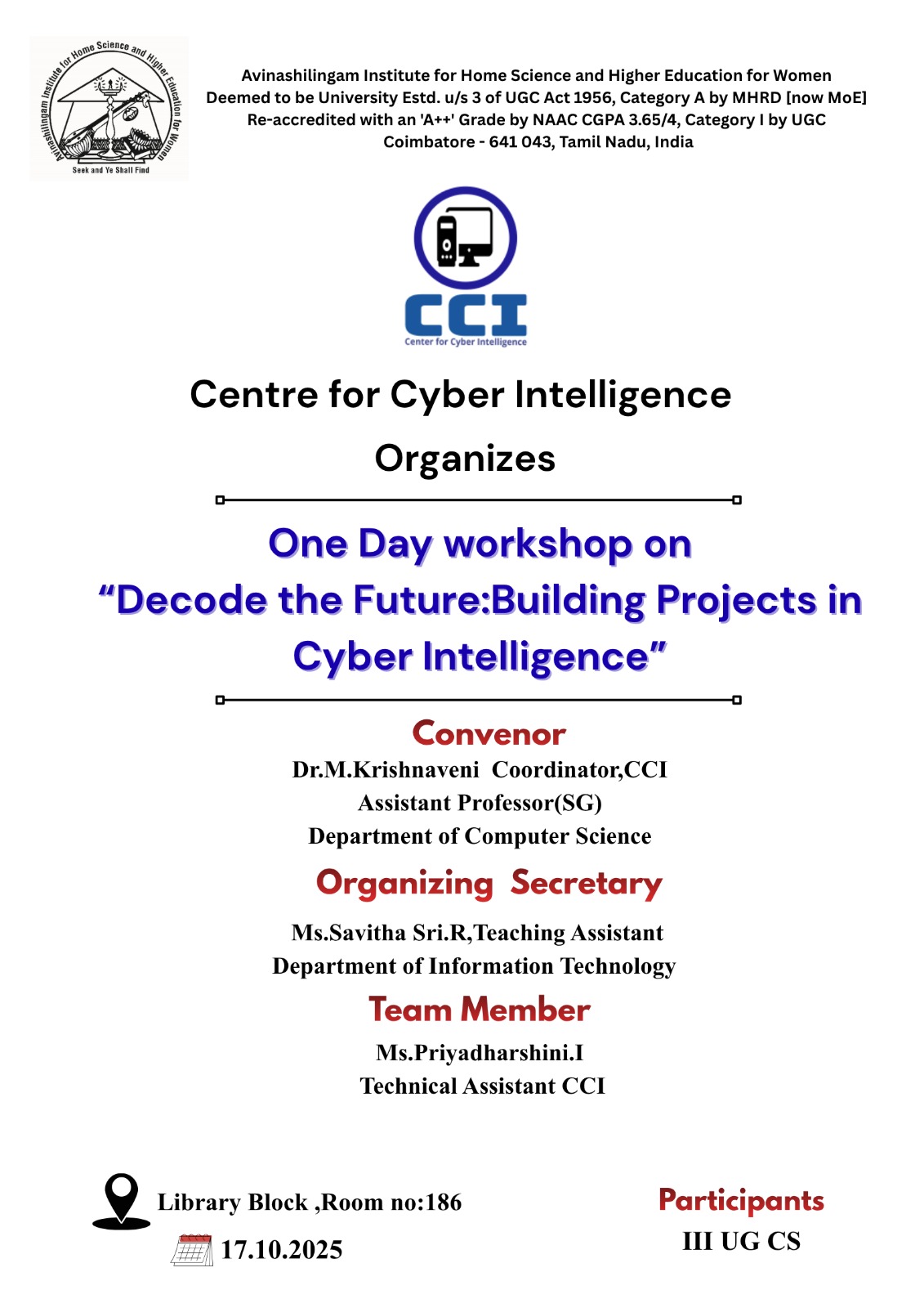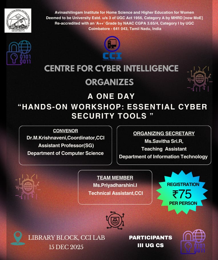 This Centre for Cyber Intelligence aims to create awareness about Cyber Security with Artificial Intelligence (AI) techniques with its practical applications. To ensure security in various sectors that address real-world problems through an AI approach. Cyber intelligence-based research and projects were given to scholars and various students from M.Sc Computer Science, Master of Computer Applications (MCA), and M.Sc Information Technology. Cyber Security certification courses were introduced for Information Technology and through hybrid mode various hands-on training programs, Workshops, Faculty Development Programs, and Internship programs are provided to the participants and students from inside and from all over India. This Centre is standalone for providing security solutions to facilitate the students and researchers to build the cyber ecosystem.
